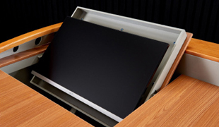 多媒体电子讲台表面采用脱脂、除酸、防磷化、静电喷塑等工艺,多媒体讲台内部机架立柱前后可调,改进后上盖门采用折叠外推式,教师操作简捷 、轻松自如,推拉键盘托盘安装隐蔽、使用方便,左右下侧折叠门让电脑等设备更易操作使用,人性化结构设计,智能控制,坚固耐用,防尘 、防盗、防火、防潮,是各大院校及中小学校、人材培训中心多媒体教室的理想选择。